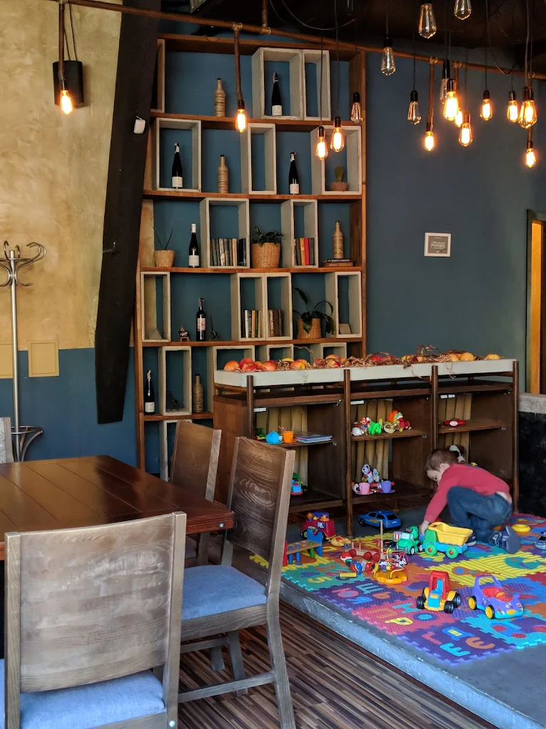 Саме в сімейній залі облаштовано дитячий куточок із іграшками для дітей різного віку – як для дівчаток, так і для хлопчиків. Передбачена також дошка для малювання, яка дозволяє малечі зайнятися творчістю під час перебування в закладі. Такий формат забезпечує баланс: батьки можуть спокійно насолоджуватися кухнею та спілкуванням, поки діти мають власний простір для гри.