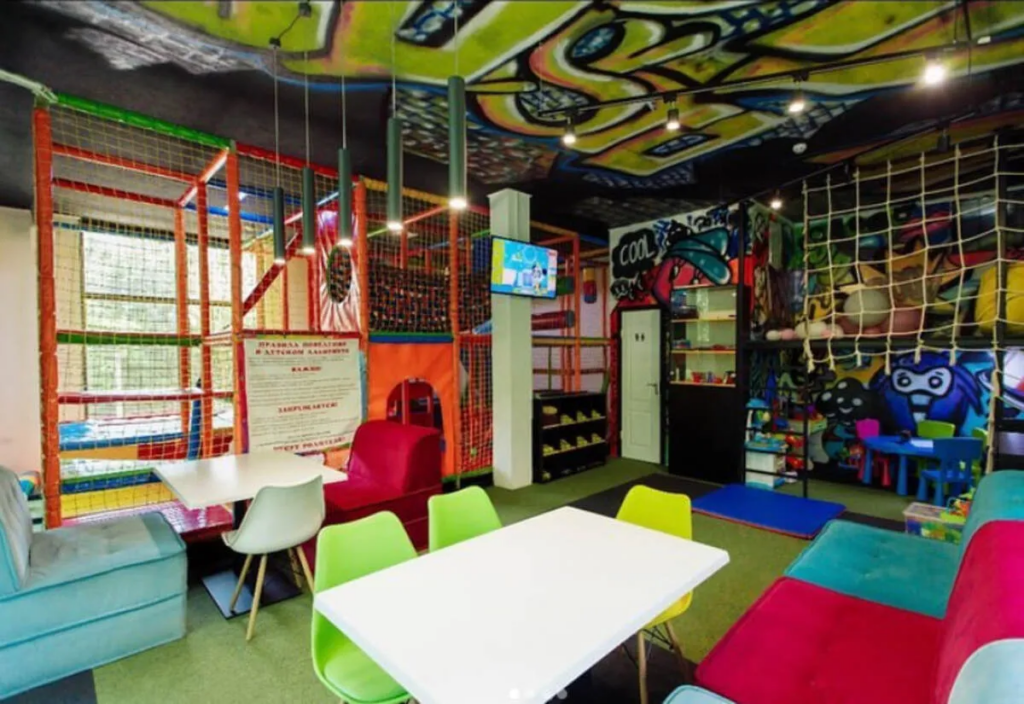 У закладі облаштовано дитячу кімнату на нульовому поверсі – з іграшками, конструктором та лазанкою для активних розваг. Тут працює няня, тож батьки можуть залишити дітей віком від трьох років під наглядом. Також передбачена можливість підключення до відеокамери за допомогою QR-коду, щоб у будь-який момент спостерігати за дитиною онлайн.