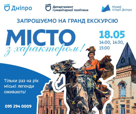 Музей історії Дніпра запрошує на грандіозну пішохідну театралізовану екскурсію "Місто з характером", яку влаштовують лише раз на рік! На гостей чекає зустріч із відставним осавулом Лазарем Глобою, засновником двох міських садів, дворянкою Інною Євецькою біля її "пряничного" будинку. Донька Петра Струкова розкриє секрети родового палацу. Архітектор Олександр Красносельський надихне силою свого архітектурного генію. А наприкінці вас зустріне "степовий Колумб" Олександр Поль, аби розповісти про його омріяне місто.