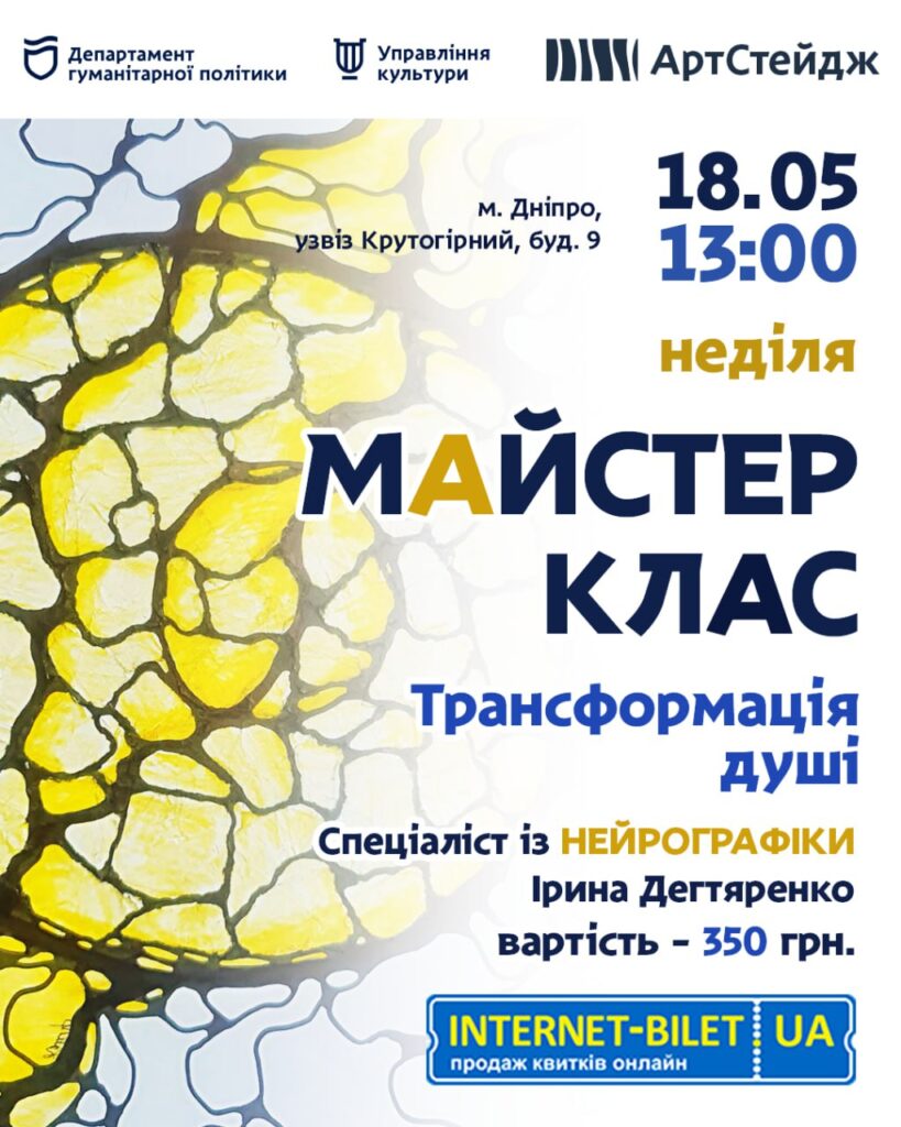 18 травня 13:00, ДніпроАртСтейдж, узвіз Крутогірний, 9. Вхід: 350 грн, детальніше тут.