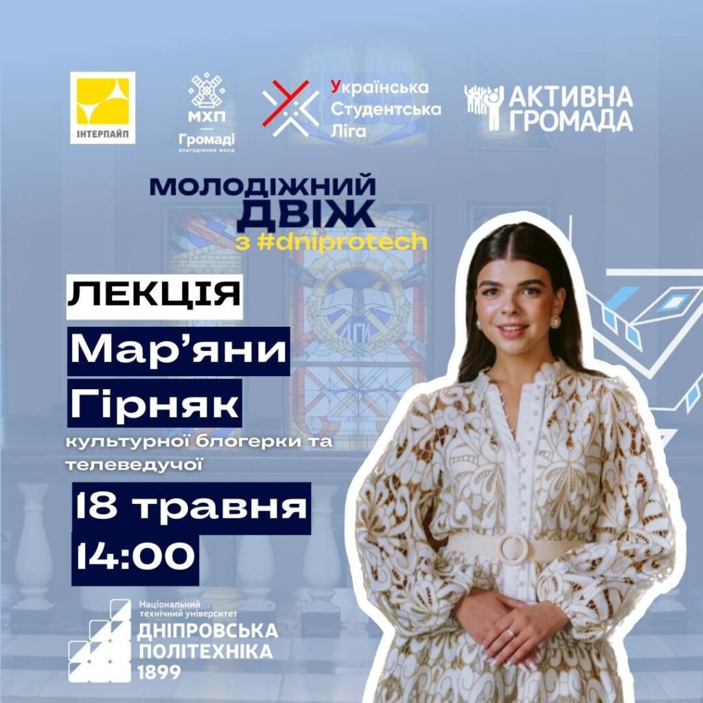 Проєкт "Молодіжний двіж з dniprotech" запрошує на лекцію "Горді бути українцями" від культурної блогерки та телеведучої Мар’яни Гірняк, яка зібрала історії, що доводять: ми маємо безліч причин для гордості. Також наприкінці події відбудеться завершальна кава, де можна буде насолодитись неформальним спілкуванням та смаколиками.