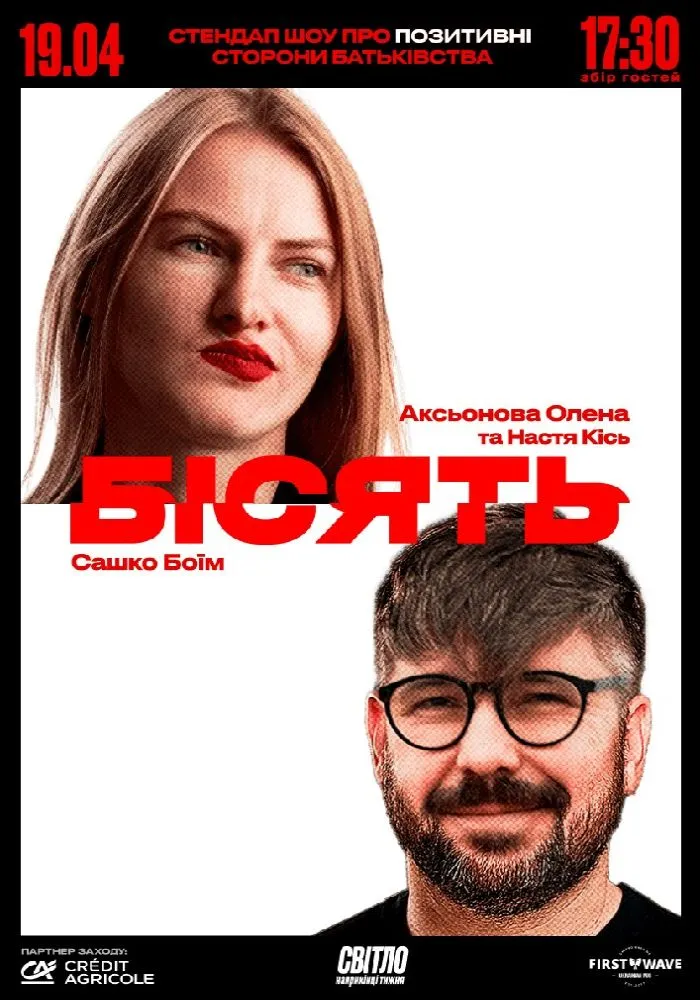 Шоу «БІСЯТЬ» — це стендап про батьківство без ідеалізації: чесно, дотепно і дуже впізнавано. Сашко Боїм, Олена Аксьонова та Настя Кісь говоритимуть про безсонні ночі, істерики в магазині та щоденні факапи, які знайомі майже кожним батькам. Це вечір, де можна не лише посміятися, а й видихнути та зрозуміти — ви справді робите все нормально.