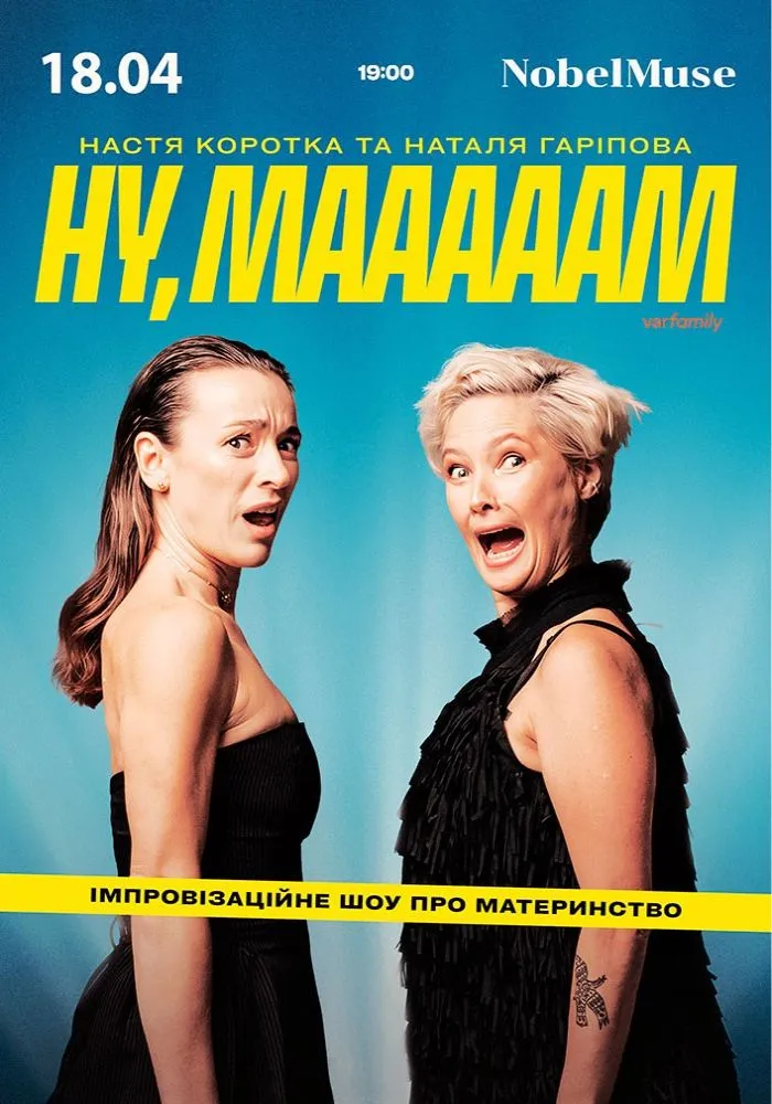 На сцені NobelMuseHall відбудеться імпровізаційне шоу «Ну, мааааам!» від Наталії Гаріпової та Насті Короткої — вечір живого стендапу, де жоден жарт не повторюється двічі. Комікеси говоритимуть про материнство без прикрас: чесно, дотепно і дуже впізнавано. На глядачів чекає яскравий гумор, імпровізація та історії, у яких легко впізнати себе або своїх знайомих.