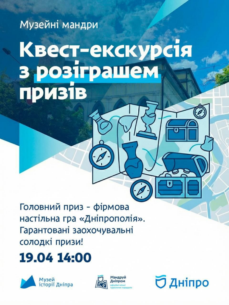 Хочете провести час не просто цікаво, а ще й з азартом? Музей історії Дніпра також запрошує на квест-екскурсію «Музейні мандри» з розіграшем призів. На учасників чекає захопливе знайомство з історією міста та його найцікавішими експонатами, після чого всі об’єднаються в команди й отримають «секретні» маршрутні конверти. Далі — 20 хвилин справжнього драйву: загадки, пошук відповідей і швидкі рішення просто у музейних залах. Фінал — підрахунок балів, аплодисменти та вручення призів. Головний подарунок — фірмова настільна гра «Дніпрополія», а для всіх учасників підготували приємні солодкі бонуси. Долучитися можна як із родиною, так і з друзями.