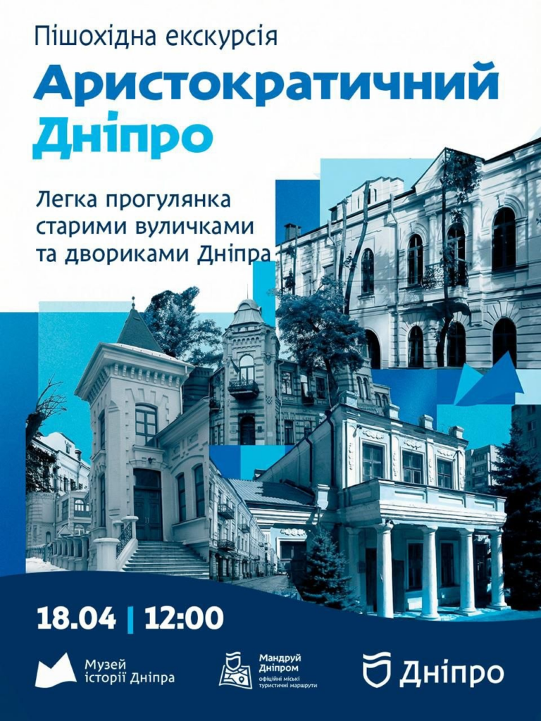 Музей історії Дніпра запрошує на прогулянку «Дніпро аристократичний». Це легка пішохідна екскурсія старими кварталами міста, під час якої перед учасниками оживе аристократичний Катеринослав із першими кам’яними будинками та вишуканими особняками. Маршрут пролягатиме до старого міста. Ви почуєте історії дворянських садиб із пишними садами та познайомитесь із місцями, де колись формувалося світське і владне життя міста.