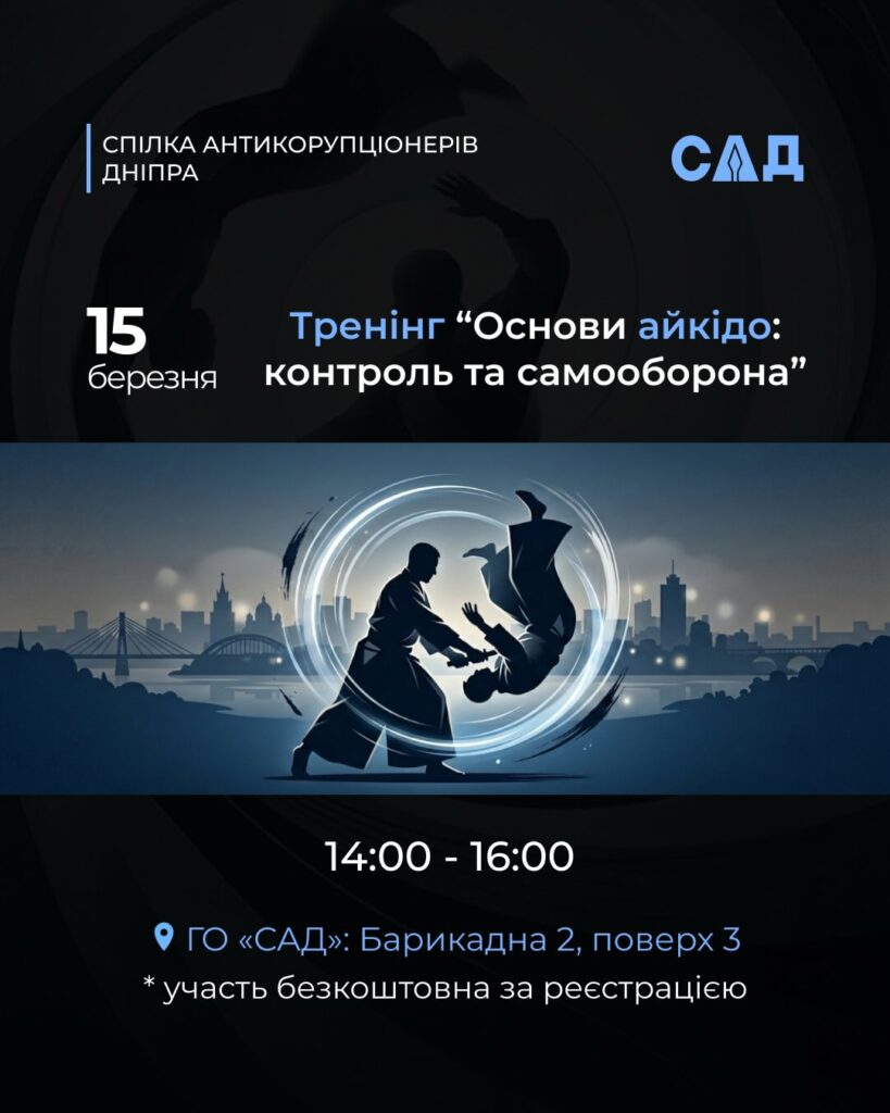 Тренінг "Основи айкідо: контроль та самооборона" допоможе сформуати навички особистої безпеки та впевнених дій у потенційно небезпечних ситуаціях. Під час заняття учасники ознайомляться з основними принципами самозахисту.