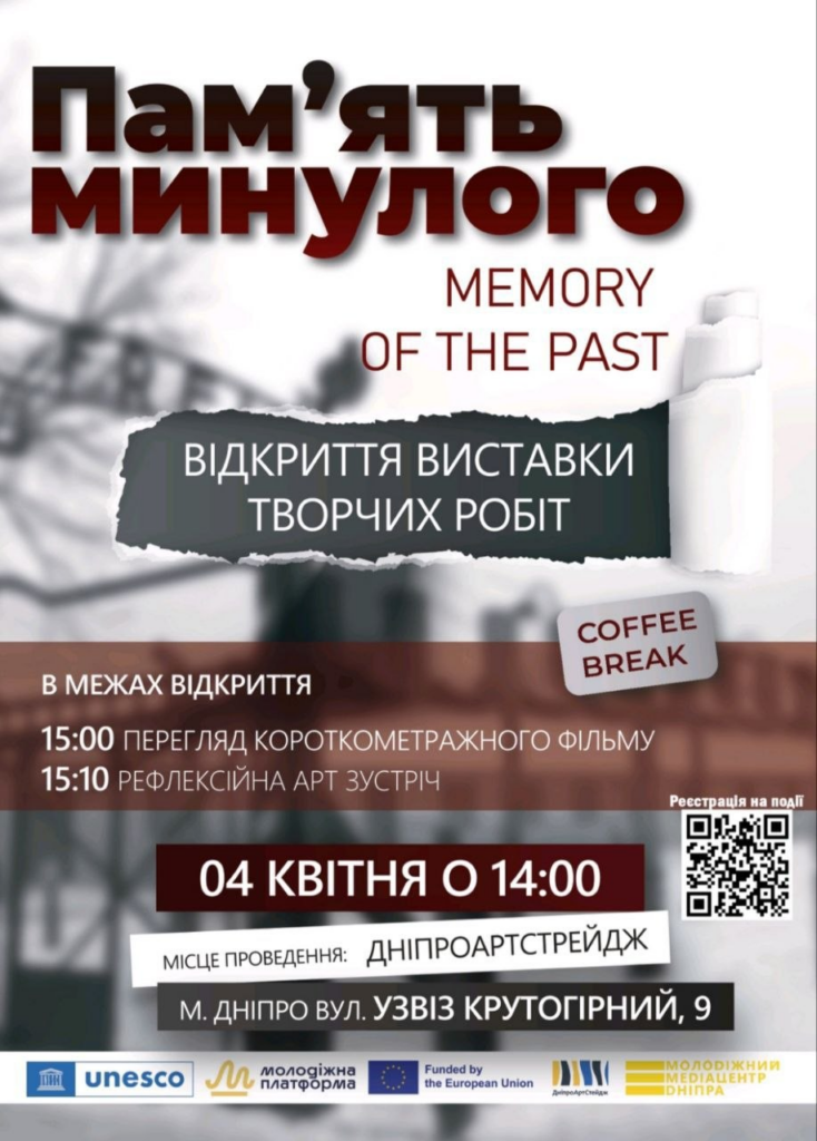 Переосмислення теми Голокосту через творчі й інтерактивні формати, близькі сучасній молоді. Усе це представлять на відкритті виставки "Памʼять минулого. Memory of the Past". Її ідея полягає в поєднанні історичної достовірності з особистим творчим осмисленням, щоб зробити цю тему глибшою та більш особистісно значущою. Виставка триватиме з 4 до 12 квітня. Також на відкритті буде кінопоказ короткометражної стрічки.