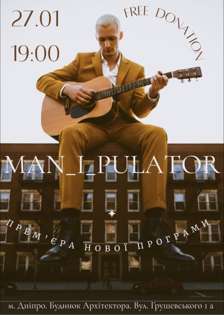 Гумор та печаль сьогодення з гітарою в руках. Це про акустичний моноконцерт з гострими сенсами від військового лікаря Сергій Лукашов "MAN_I_PULATOR". Ви почуєте авторські пісні. Сумно і нудно вам точно не буде!