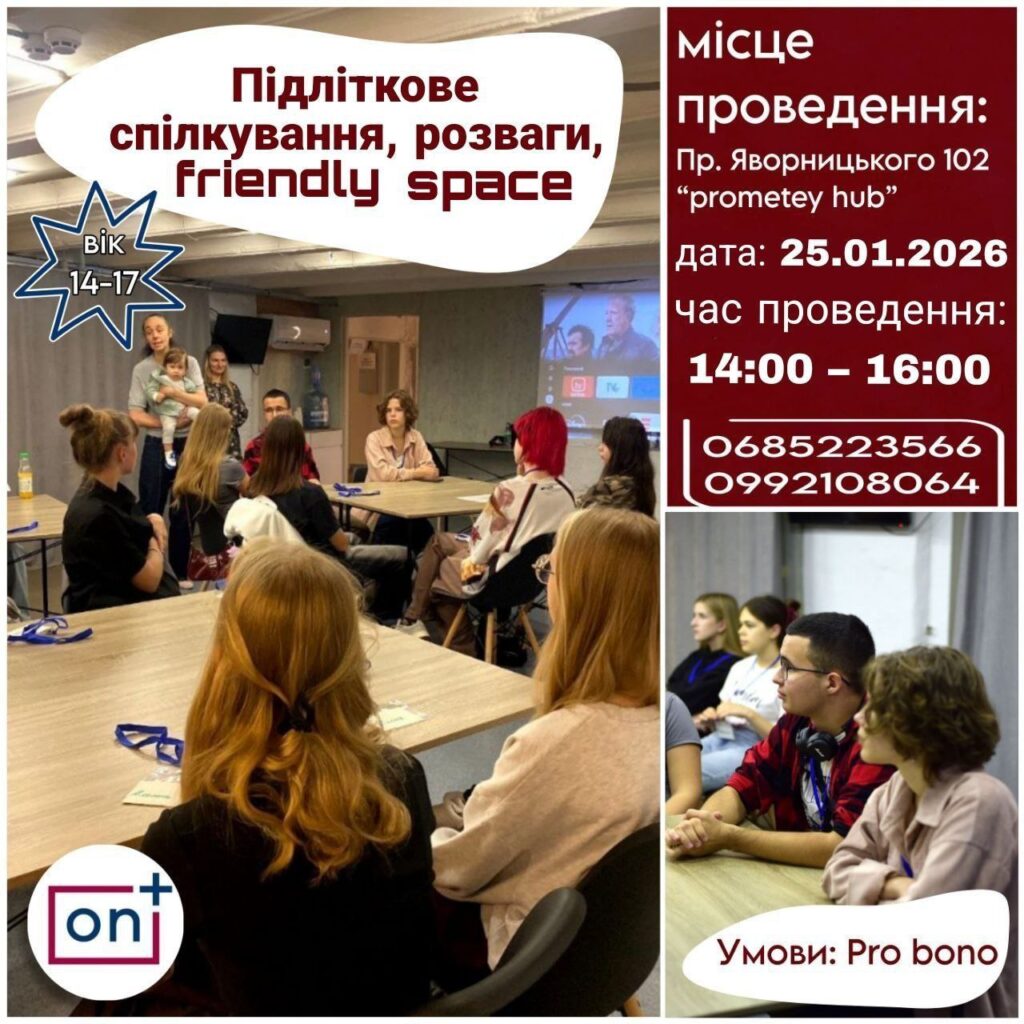 Хочете поспілкуватися, знайти нових друзів або цікаво провести час? Тоді завітайте на дружню зустріч неформального спілкування "Friendly space" для підлітків 14-17 років. На вас чекатиме: спілкування з однолітками, настільні ігри, майстер-клас з квілінгу та дружня атмосфера.