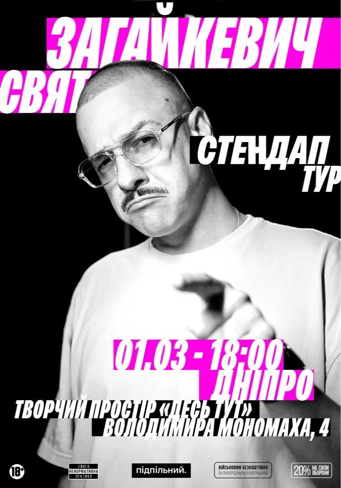 Стендап комік Свят Загайкевич, засновник та очільник "Підпільного Стендапу" запрошує вас на свій сольний стендап концерт. У програмі новий матеріал, написаний в євротурі. Буде смішно, смішно, дуже смішно.