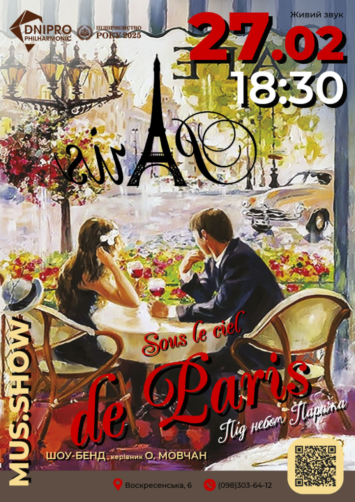 Закрийте очі, уявіть… Ви, мальовничий вечірній Париж, тераса кафе, де подають найсмачніший крем-брюле в місті та грає жива музика… У програмі вечора пісні Едіт Піаф, Мірей Матьє, Даліди, Джо Дассена та інші французьких зірок зі світовим ім'ям. Лунатимуть пісні, що символізують справжнє, нестримне французьке кохання, у виконанні чисельних солістів та віртуозного ансамблю й акордеоніста.
