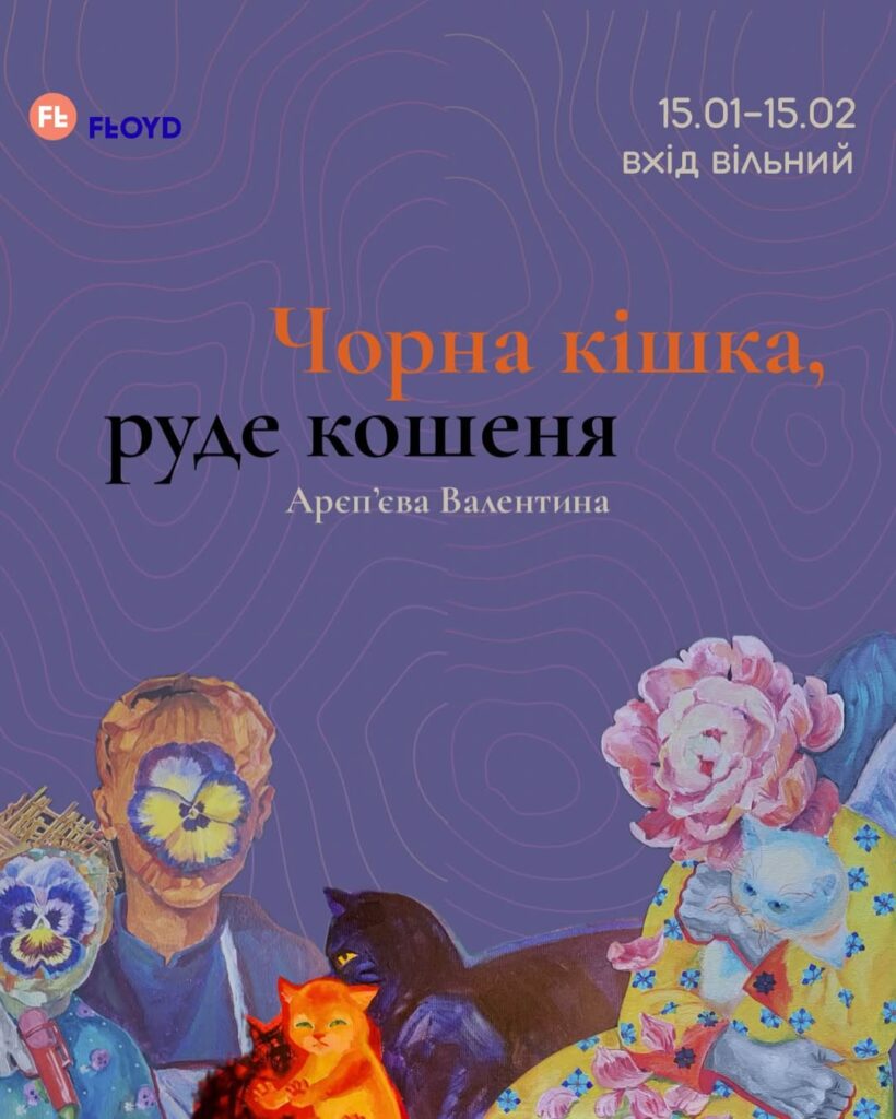 З 15 січня у Floyd вікрилась персональна виставка Арєпʼєвої Валентини "Чорна кішка, руде кошеня" – символічне означення війни і того, що вона несе. Поряд з втратами, горем, безнадією ми опукліше бачимо хороше, промінчики віри, світлих людей. Гуртуймося навколо вогню щоб воно не згасло. Вхід вільний.