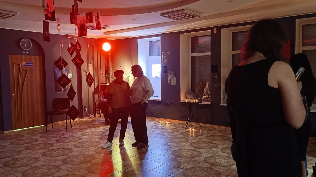 13 фотопортретів на завішених стінах чорною тканиною. Кожен освітлювався й містив QR-код, який відкривав аудіоісторію героя.