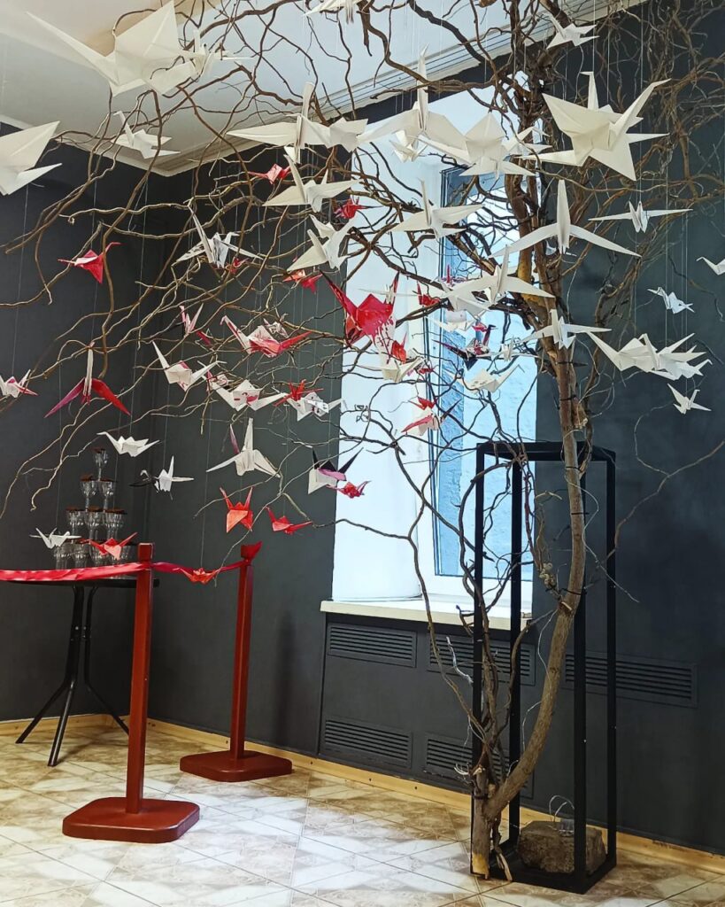 Олена Іванова – дніпровська художниця, поетеса й архітекторка – створила інсталяцію, у центрі якої були паперові журавлі, як багатозначний символ. Для когось — це символ надії, для інших — крик про дім, якого більше немає.