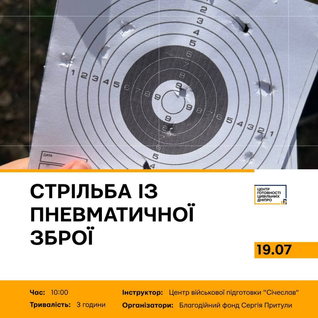 Центр готовності цивільних Дніпро запрошує на тренінг "Стрільба з пневматичної зброї". На вас чекатиме: відпрацювання стрільби з різних положень (стоячи, з коліна, лежачи), робота зі свинцевими кулями, індивідуальні консультації від досвідчених інструкторів.