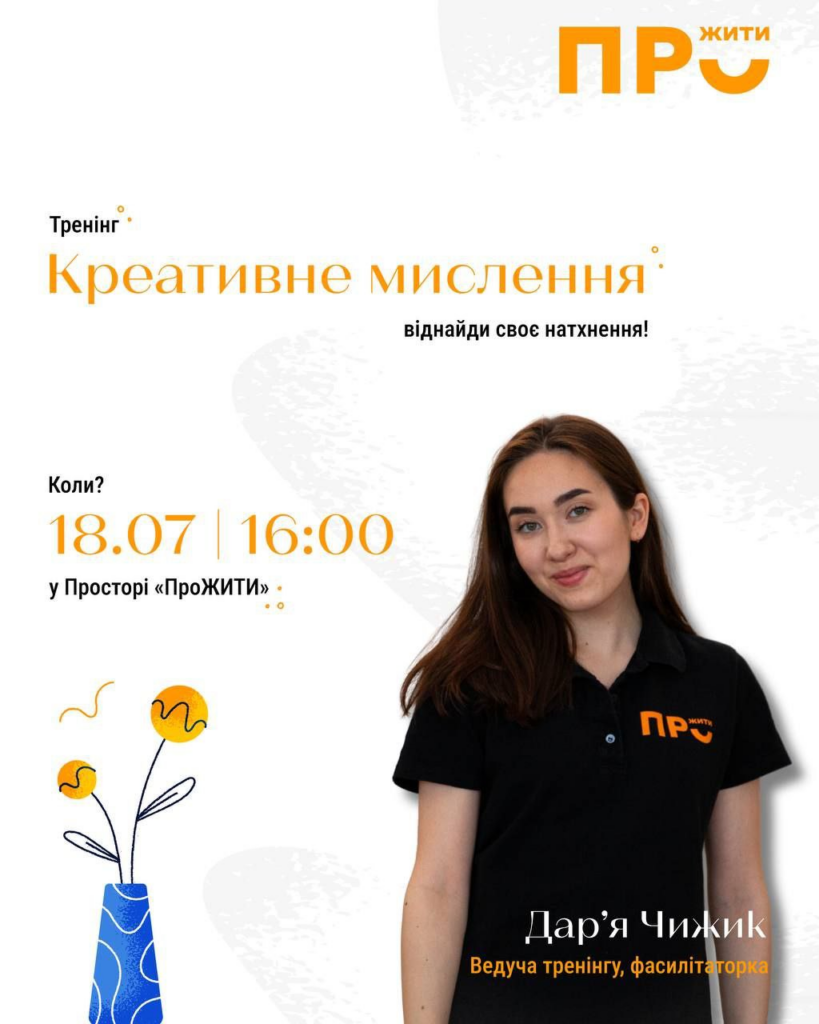 Вірите, що творчість — це тільки для художників, дизайнерів чи музикантів? Відчуваєте втому, вигорання чи творчу пустку? Тоді вам на тренінг з креативного мислення від фасилітаторки Дар’ї Чижик. Вона покаже, що креативність — це не тільки про "мозкові штурми" і фліпчарти. Це про здатність бачити нові рішення і впроваджувати їх. І це — для кожного! Запрошують усіх, хто щодня підтримує інших — соціальних працівників, психологів, волонтерів, освітян і всіх бажаючих.
