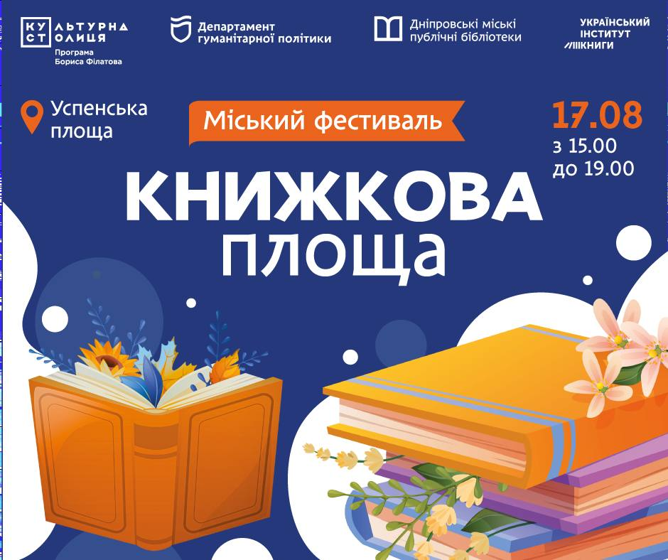 Головна подія цього літа — масовий книгообмін просто неба! Дніпровські міські публічні бібліотеки запрошують усіх книголюбів на міський фестиваль "Книжкова площа"! Приносьте свої книжки у хорошому стані та будь-якою мовою, крім російської. Обмінюйте свої книги на нові для себе видання. Крім цього, на фестивалі ви зможете поспілкуватися з однодумцями, письменниками та поетами. А також усі охочі зможуть відвідати панельні дискусії.