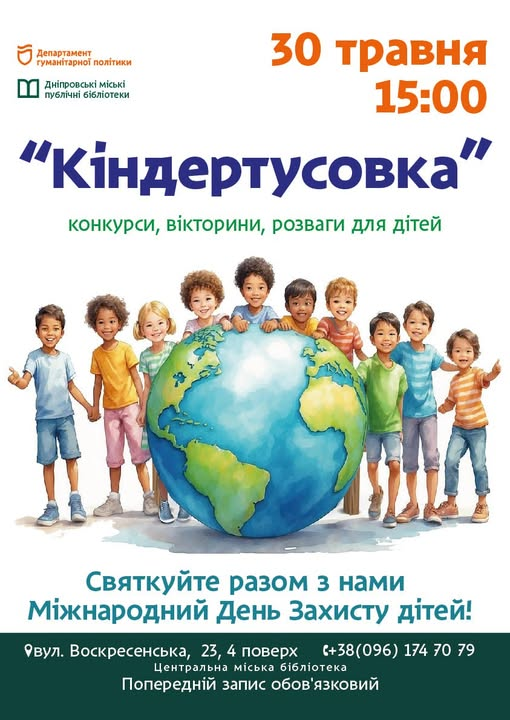 Дніпровські міські публічні бібліотеки запрошують всіх малюків і їхніх батьків на незабутню "Кіндертусовку". У програмі цікаві конкурси та вікторини, захопливі розваги для дітей усіх вікових категорій. Відсвяткуйте Міжнародний День Захисту Дітей так, як це люблять справжні супергерої дитинства — з радістю, іграми та подарунками!