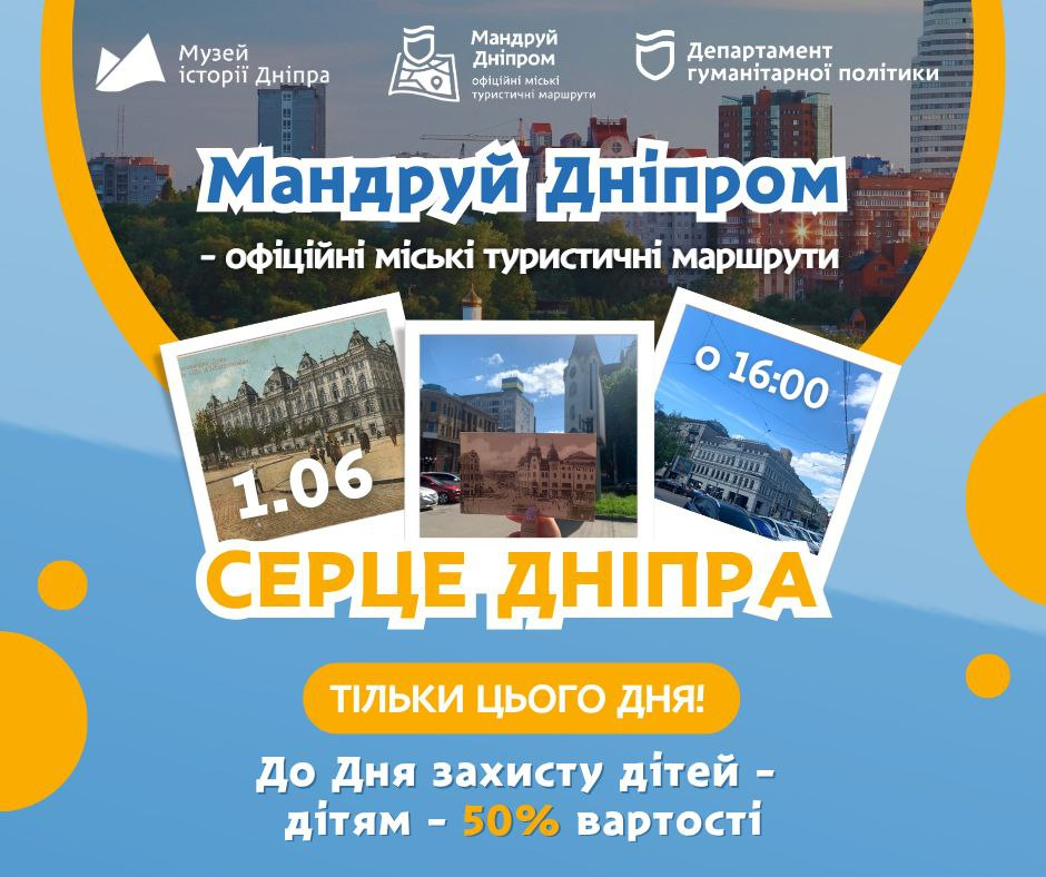 Музей історії Дніпра запрошує на пішохідну екскурсію "Серце Дніпра". До Дня захисту дітей – всім дітям знижка 50%. Під час екскурсії ви дізнаєтесь як виглядав Проспект старого міста до приїзду катеринославського губернатора Андрія Фабра, які річки перетинали Проспект ще 100 років тому, звідки бралися та куди врешті зникли. А також про нереалізовані архітектурні плани та мрії міста на Дніпрі.