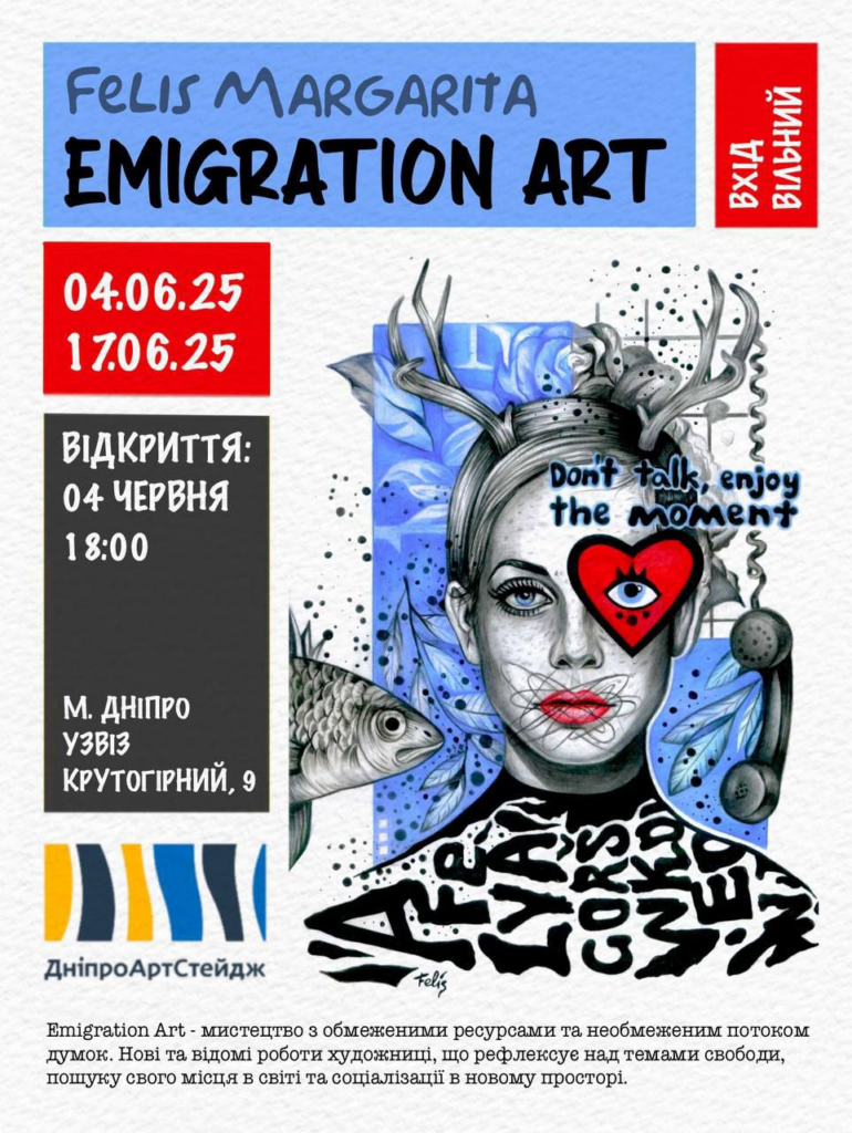 DniproArtStage запрошує на персональну виставку графіки мисткині та письменниці Маргарити Феліз, створеної в еміграції з 2022-го по 2025-й роки. Представлені роботи відображатимуть переживання авторки воєнного досвіду за кордоном.