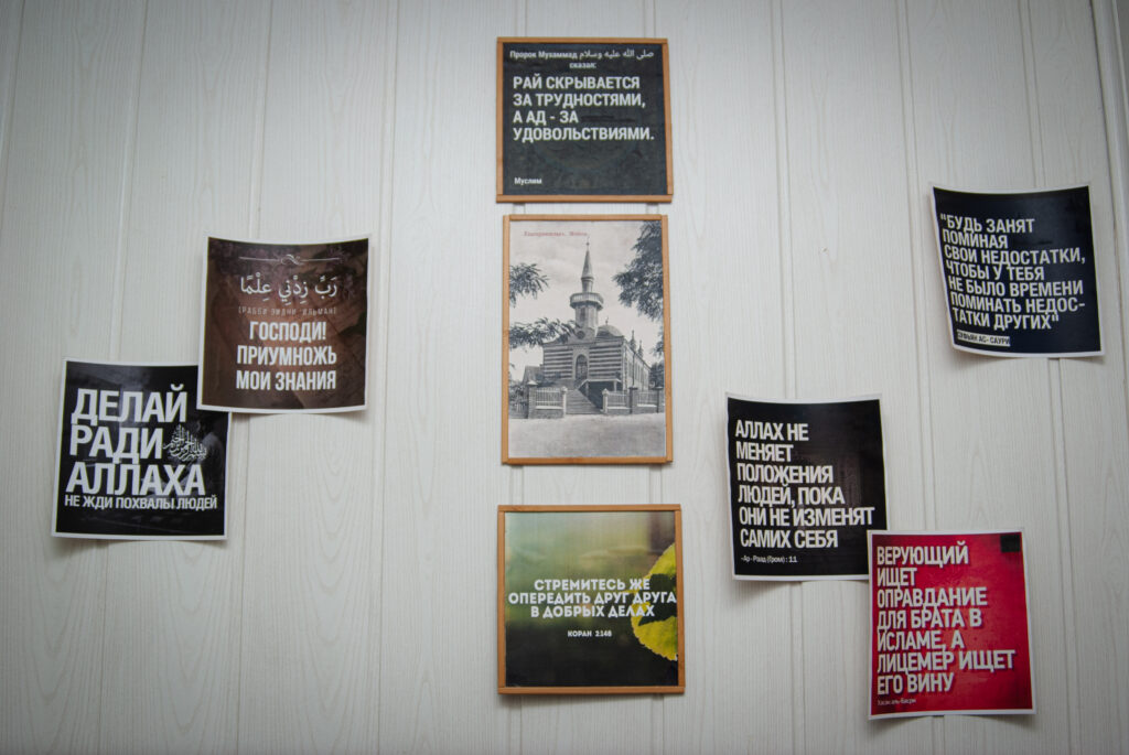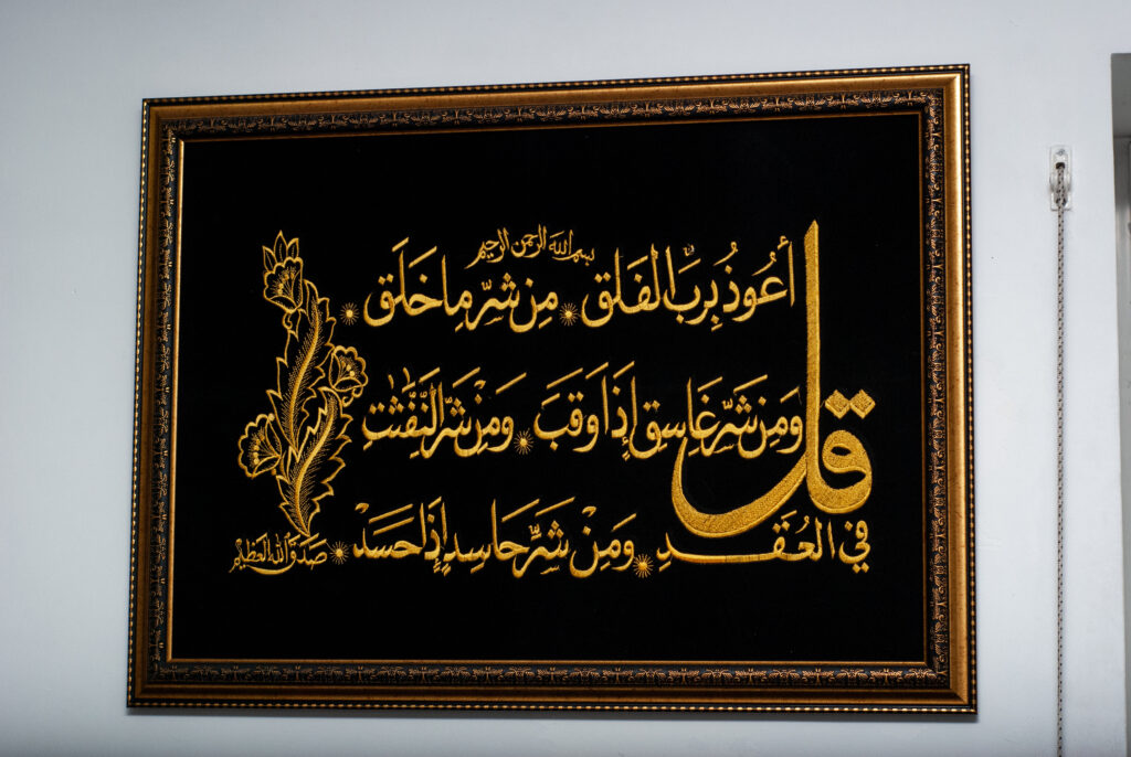 Зліва від входу розташований невеликий стенд із цитатами з Корану (центральний релігійний текст ісламу):