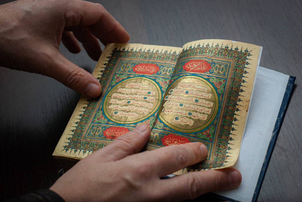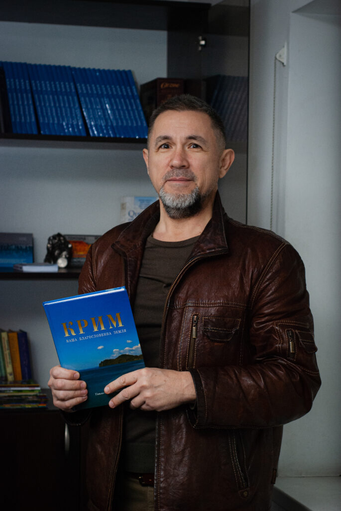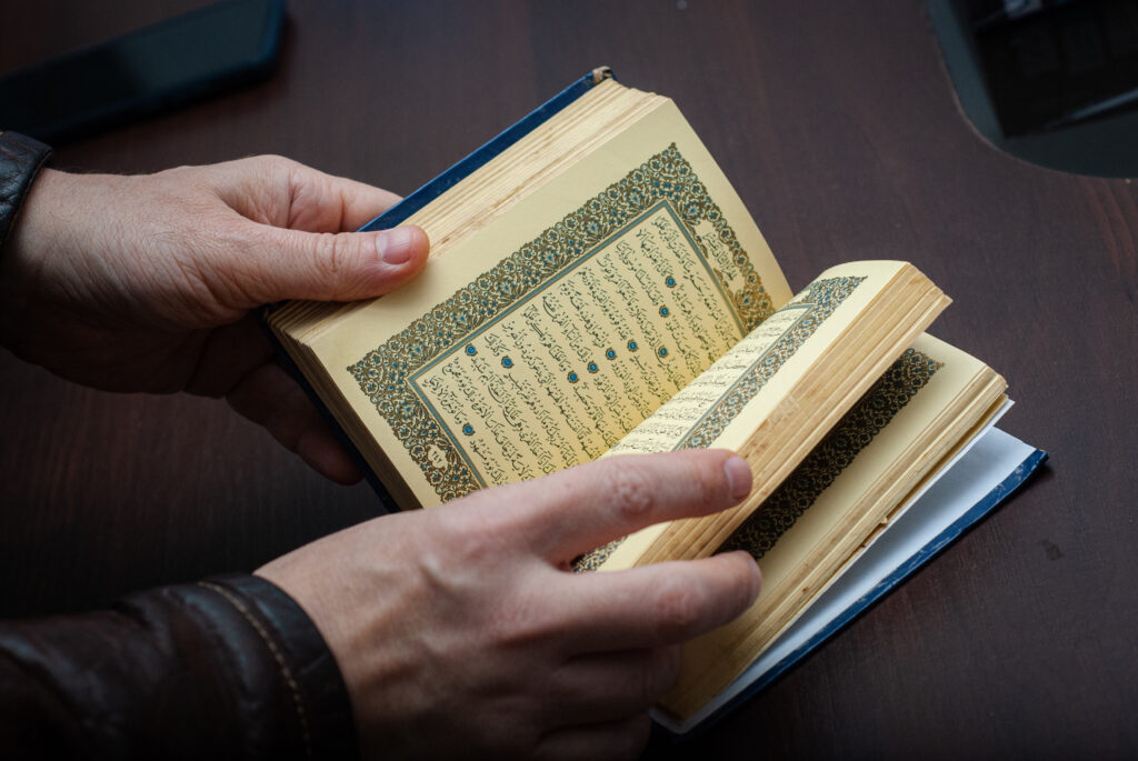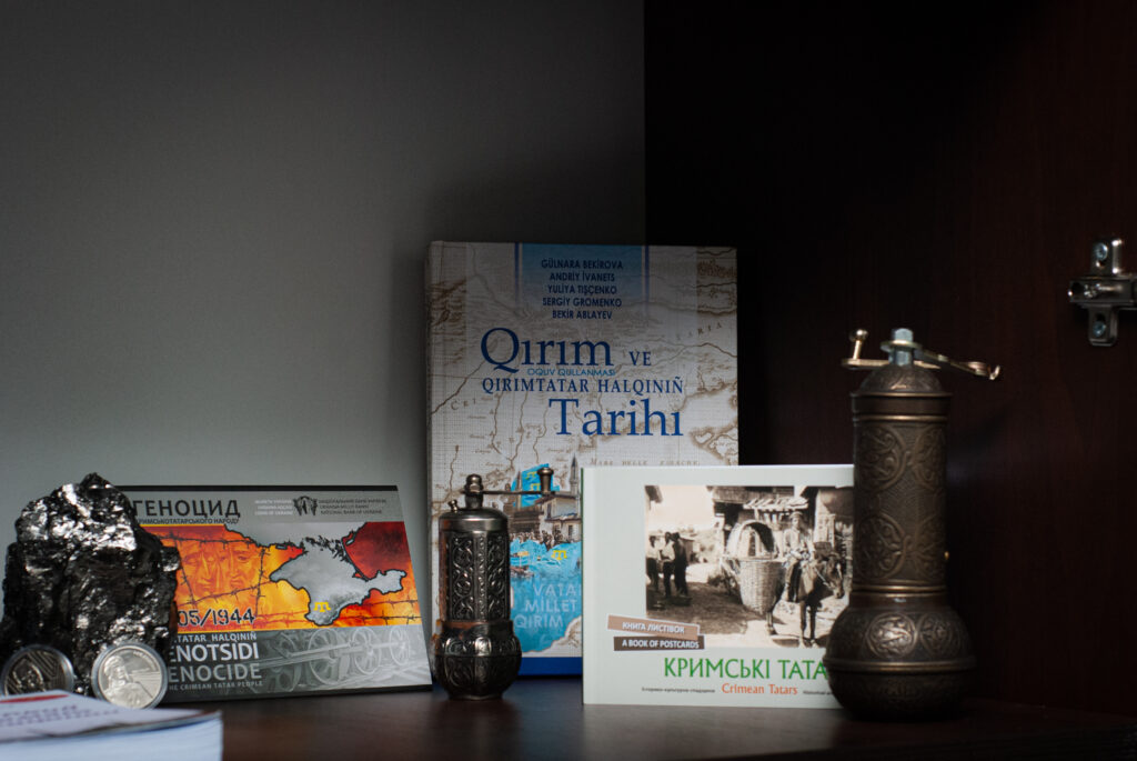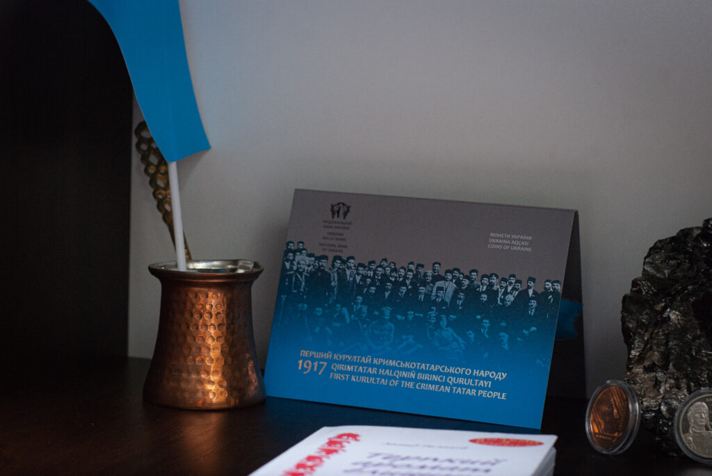 Кемал запрошує нас до основної зали орендованого приміщення, де стоїть великий стіл, поряд з ним багато шаф з літературою про Крим, іслам та кримських татар. На стіні – велика мапа України та цитата рідною кримськотатарською мовою. Чоловік відчиняє одну з шаф і дістає звідти невеличку книгу зі старими пожовклими сторінками. Починає її гортати з права наліво, бо саме так читають Коран в оригіналі.
