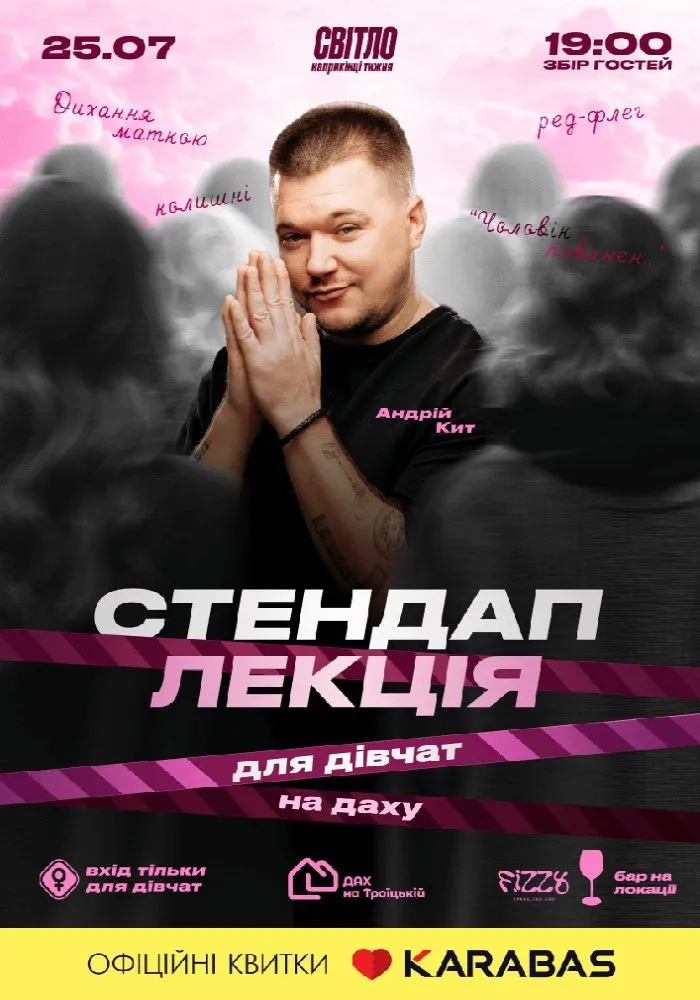 Стендап лекція для дівчат від "СВІТЛО" – це місце без забобонів, де ви від душі посмієтеся з відносин. Андрій Кит розповість про "чоловічо-жіночі" штуки – з гумором, без фільтрів і максимально відверто. Обговорить емоції, непорозуміння між чоловіками й жінками, "колишніх" та інші теми, які ви самі оберете. Буде смішно, безцеремонно й інтерактивно.