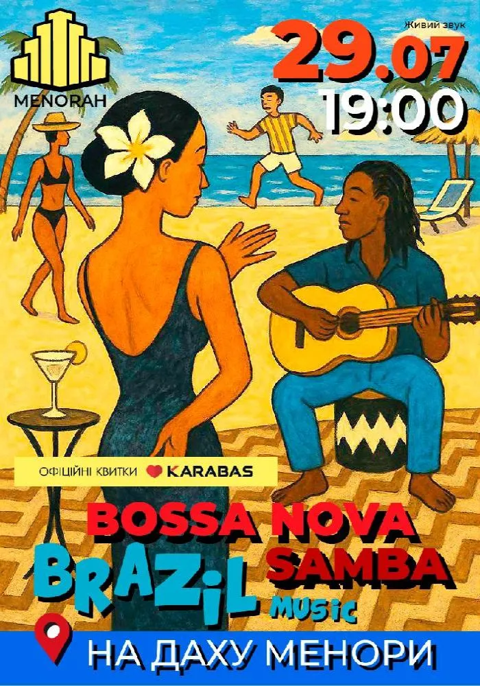 Цього літнього вечора вас чекає музична імпровізація просто неба – в самому серці міста, під зірками й у супроводі живого звучання. "Bossa nova & Samba" – музика, що дихає океаном! Це не просто жанр – це стиль життя. Це вечір емоцій, джазової свободи й натхнення – для тих, хто любить глибоку музику та нові враження.