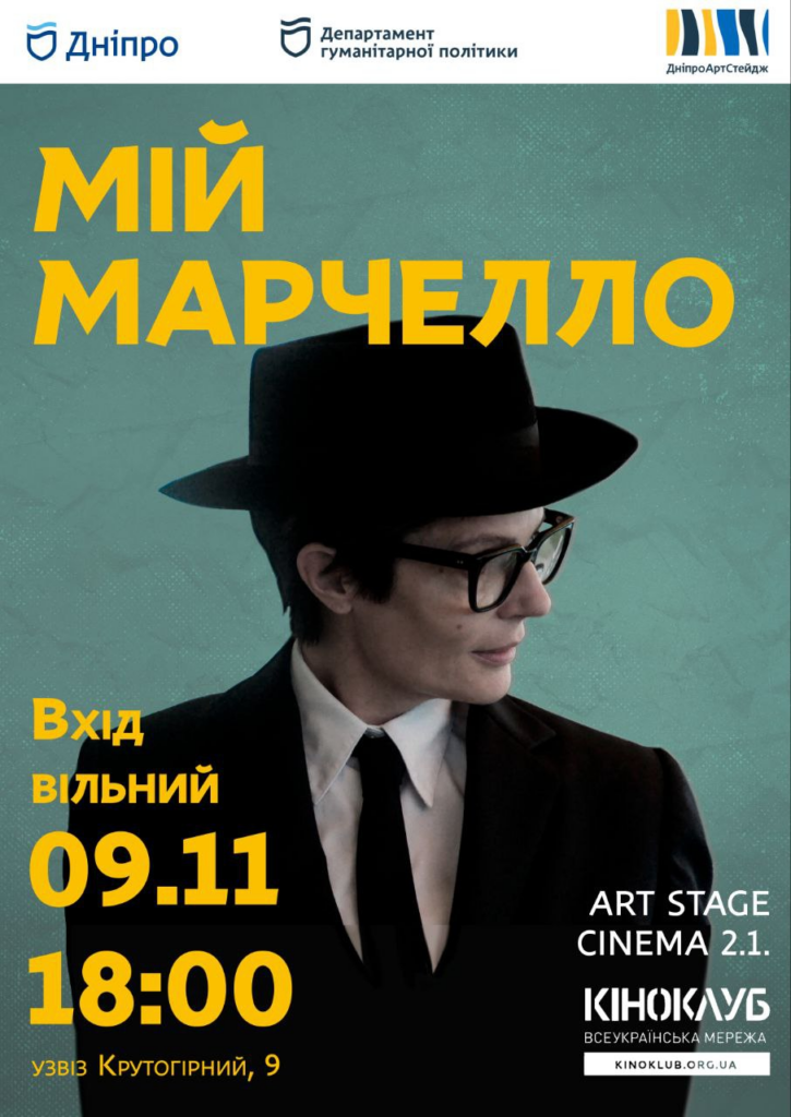 Art Stage Cinema Club запрошує на перегляд фільму "Мій Марчелло". Стрічка про доньку кінозірок Марчелло Мастроянні та Катрін Деньов. Акторка К'яра втомилася від порівнянь із батьками. Після вимоги на чергових пробах зіграти "як Мастроянні", вона вирішує перевтілитися у свого покійного батька буквально. Жінка настільки переконлива в цьому образі, що до неї починають звертатися "Марчелло". Одних це обурює, других захоплює, а треті починають вірити у воскресіння легенди.