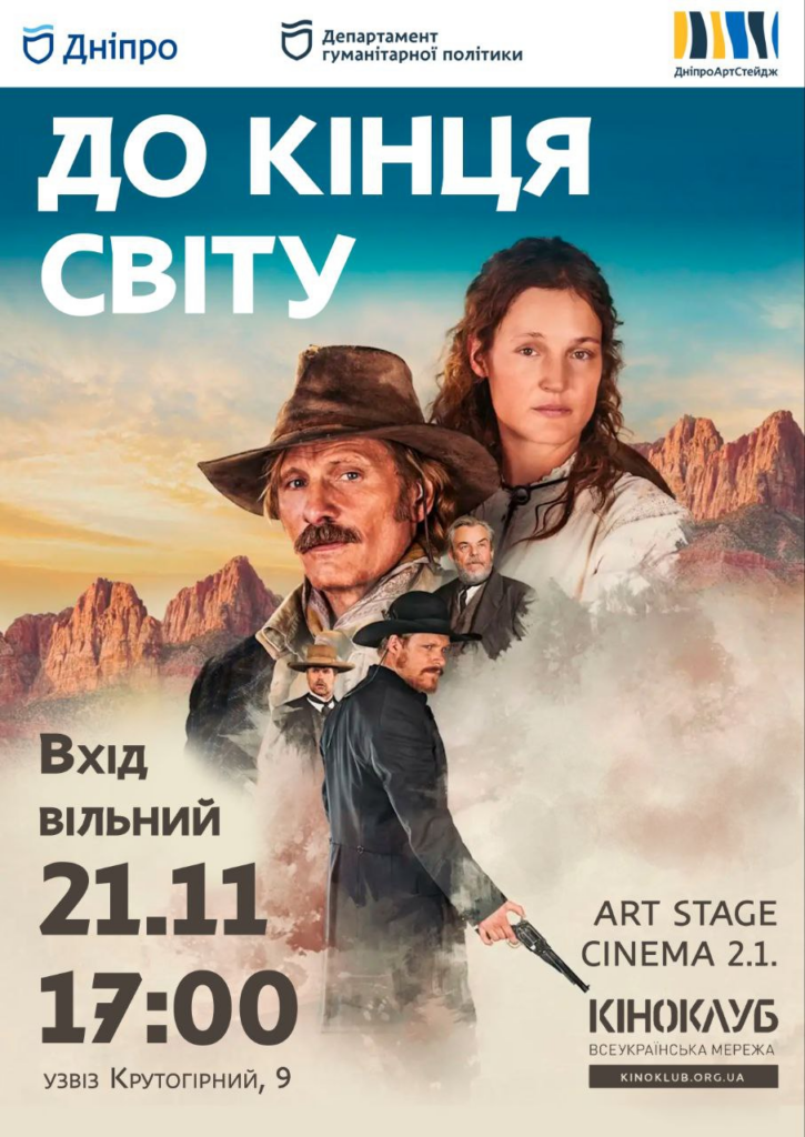 Art Stage Cinema Club запрошує на перегляд кінострічки "До кінця світу". Фільм про квіткарку Вів’єн і тесляра, які закохуються та вирушають у мандрівку, щоб побудувати спільне життя у глухому містечку. У країні набирає обертів Громадянська війна і їхні мрії руйнуються, коли чоловік доєднується до армії.
