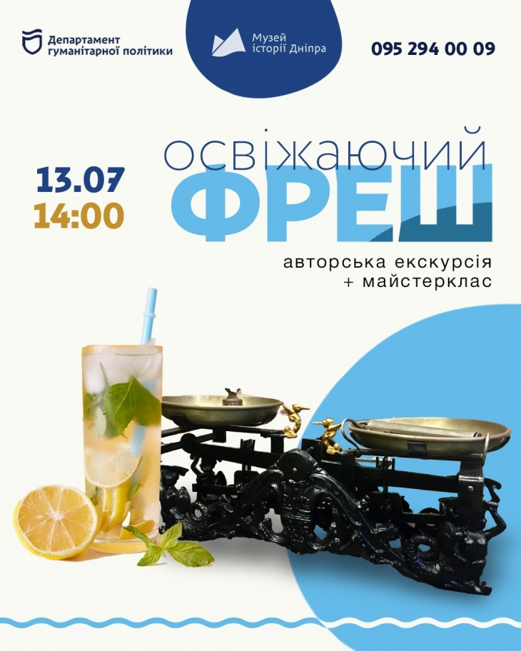 Музей історії Дніпра запрошує на авторську екскурсію "Освіжаючий фреш" та атмосферний майстер-клас. Поговоримо про цікаві історичні факти, спробуємо зважити на гирькових і пружинних вагах, зробимо освіжаючий літній напій.
