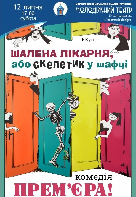 Дніпропетровський академічний молодіжний театр запрошує на виставу "Шалена лікарня або Скелетик у шафці". Це справжній апокаліпсис! Колеги, друзі та жінки не дають перспективному доктору влаштовувати свою блискучу кар'єру. Саме так... А може то він сам? Може це з його шафки вивалюється назовні несподіваний скелетик?