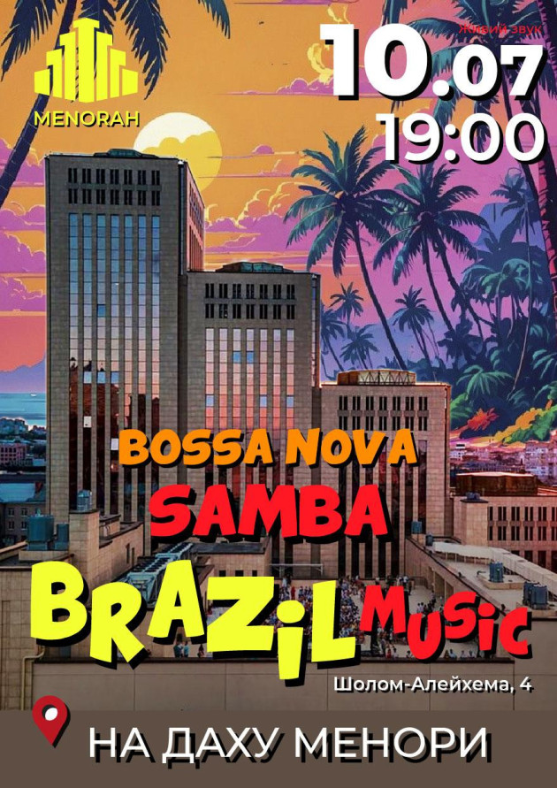 Цього затишного вечора просто неба на даху Менори ви не тільки почуєте, а й відчуєте народження спонтанної музичної імпровізації, де кожна нота – несподіванка. "Bossa nova&Samba" – музика, що дихає океаном! Музика, яка народилася в Ріо та заговорила з джазом. На вас чекає оксамитовий вокал Варвари Хижнякової у спроводі емоційного шоу-бенду.