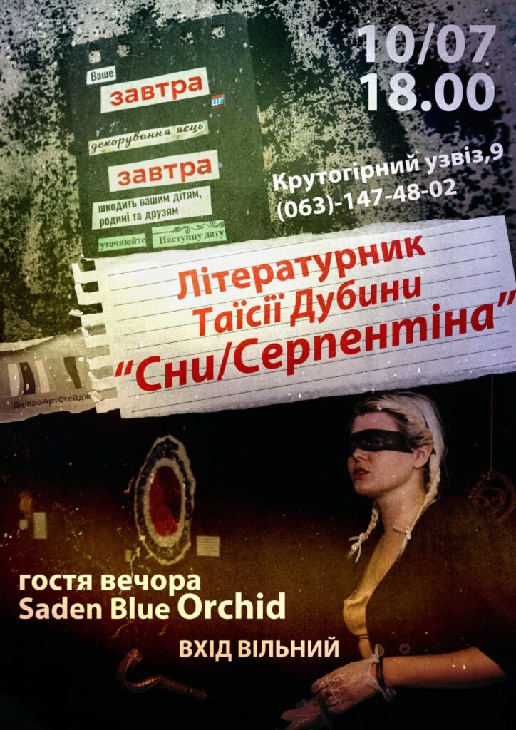 Запрошуємо на літературник, що об'єднає нову та вже добре знану поезію Таїсії Дубини, завершену, незавершену та подекуди приховану прозу. Спеціальна гостя вечора мультидисциплінарна мисткиня: художниця, поетка, музика – Saden Blue Orchid. Приходьте слухати, чути та, за бажанням, читати своє.