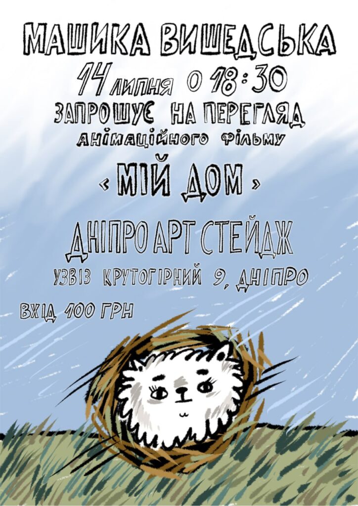 Анімаційна прем’єра в АртСтейдж! Мультидисциплінарна мисткиня з Бахмута Машика Вишедська везе до нас свою нову відеороботу. Короткометражний анімаційний фільм "Мій дом" створено на основі однойменного коміксу і ессе, у яких мисткиня рефлексує щодо втрати дому та самого поняття, що значить "дім", власний шлях його пошуку та відчуття дому.