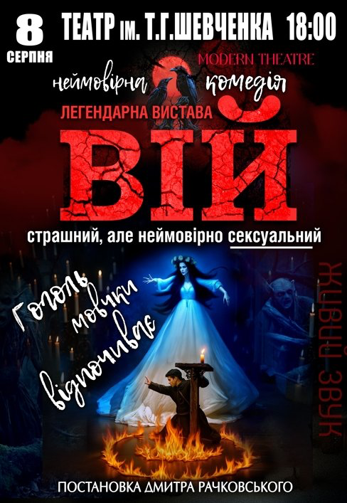 Театр Шевченка запрошує на виставу "Вій", де страшна історія смерті красуні Панночки перетворилася на веселу феєричну комедію з веселими танцями, дотепними жартами і текстами, написаними метрами гумористичного жанру. У порівнянні з цим спектаклем відпочиває будь-яке гумористичне шоу.