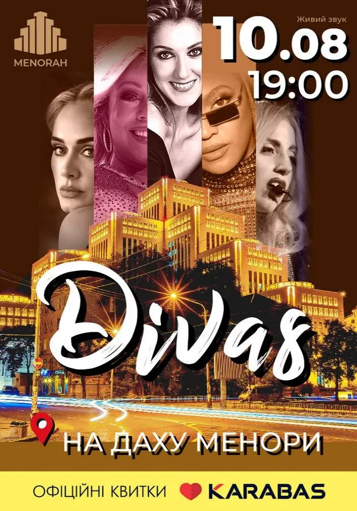 "Менора" запрошує на грандіозне шоу "DIVAS", присвячене найвидатнішим жінкам у світі музики. Прозвучать найвідоміші та найулюбленіші хіти легендарних королев поп-сцени: Бейонсе, Селін Діон, Монсеррат Кабальє, Мераї Кері, Леді Гаги та Адель – усе в одному розкішному концерт. Нестримна енергетика, світло софітів, атмосфера пристрасті та романтики – складові вражаючого шоу.