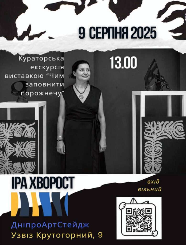 ДніпроАртСтейдж запрошує на кураторську екскурсію виставкою "Чим заповнити порожнечу", яку особисто проводитиме авторка Ірина Хворост. Мисткиня розповість про проєкт "Повернення з війни", а також проведе вас світом концепцій, втілених в експозиції.