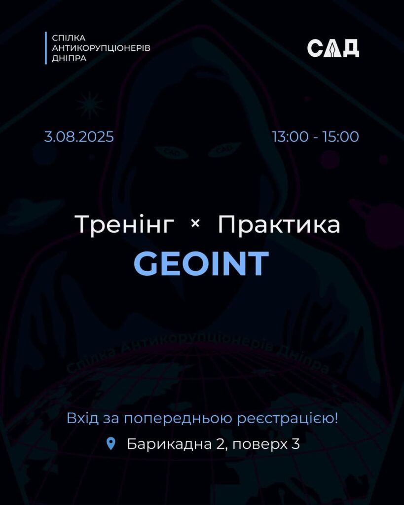 ГО "Спілка антикорупціонерів Дніпра" запрошує на тренінг "GeoINT: Геопросторова розвідка". Під час якого вас очікує коротке вступне ознайомлення з GeoINT – без заглиблення, адже для глибокого вивчення потрібен значно більший час.