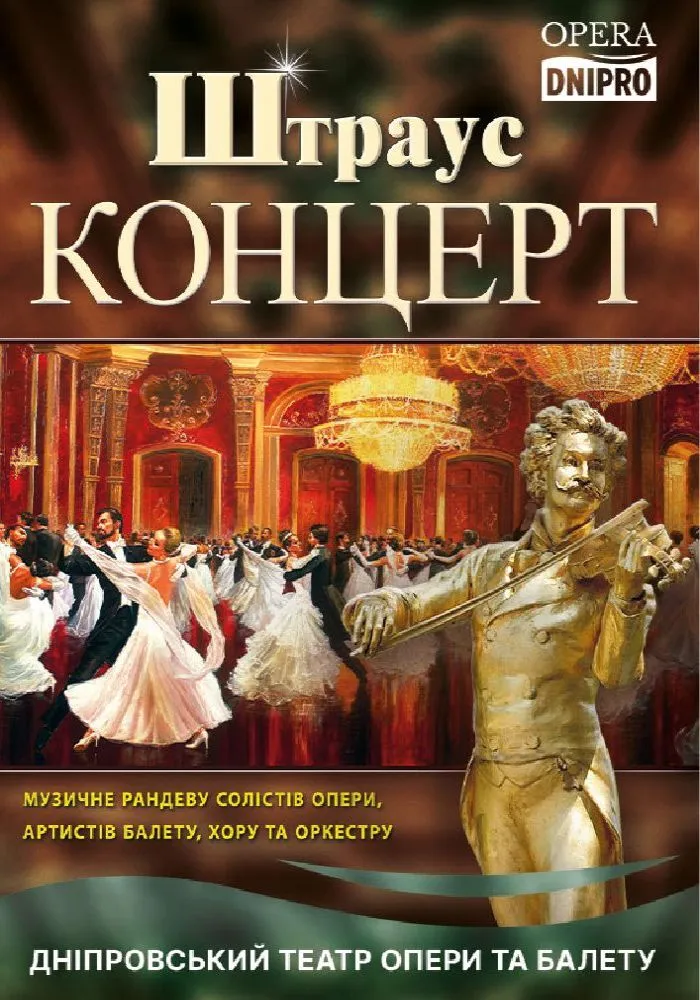 Театр Опери та балету запрошує на Штраус Концерт. Безсмертні мелодії "короля вальсу" – це поєднання музики, танців та вокальних номерів від солістів опери та артистів хору. А найголовніше – це гарний настрій. Тому що музика Штрауса – це бризки шампанського, вихор танцю та посмішок, який подарує всім можливість на деякий час поринути у світ віденського балу. Адже саме цього нам всім сьогодні не вистачає – відчуття миру, радості та легкості. У цей вечір на вас чекають не тільки улюблені вальси Штрауса, а також чардаші, польки, марші, арії та дуети з улюблених оперет. І авжеж – незабутні сюрпризи від постановників.