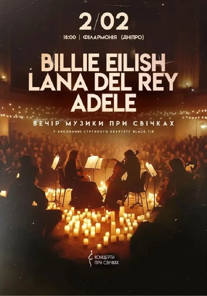 Вечір музики при свічках Billie Eilish, Lana Del Rey, Adele. Це вечір, де сучасна музика набуває нового звучання у виконанні струнного квартету Black Tie. Сотні мерехтливих свічок створюють атмосферу, що поєднує ніжність, силу й драматизм. Це подія, яка подарує слухачам не лише музику, а й особливі відчуття, коли знайомі мелодії відкриваються по-новому.