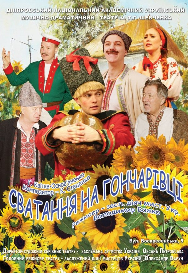 Вистава "Сватання на Гончарівці" йде на сцені театру вже декілька десятиліть. Це й не дивно, адже тема кохання – одвічна тема, а п’єса є чи не найкращою у доробку класика. Яскраві образи, створені класиком і відтворені акторами примушують глядача сміятися, радіти, співчувати, а деколи і замислитися. Чарівні пісні й весільні обряди не залишать байдужими нікого.