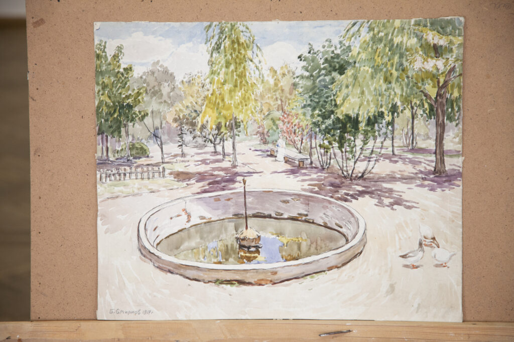 Найцікавіша з них – акварель "Катеринослав у XVIII столітті" (1917 рік). На ній художник поєднав історичне уявлення про місто із власною фантазією. На передньому плані – міський сад: молоді дерева, проміння сонця, гуси, що вільно гуляють між клумбами. Далі – ошатна дама на лавці, спокійна атмосфера прогулянки. Це не реалістичний пейзаж, а радше спроба "намалювати уяву", навчити бачити минуле крізь художній образ.