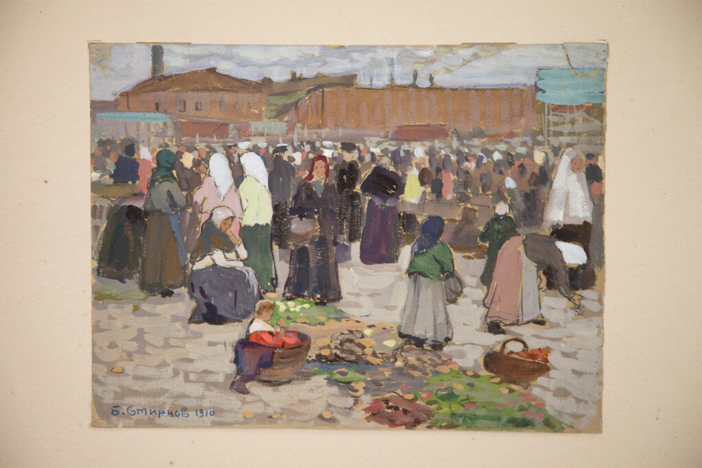 Не менш цінною є інша його робота – "Озерний базар" (1910 рік). Тут Смирнов звертається вже не до вигаданого, а до реальності свого часу. Акварель відтворює жвавий міський ринок початку ХХ століття – документальне свідчення того, як виглядала Озерка понад сто років тому.