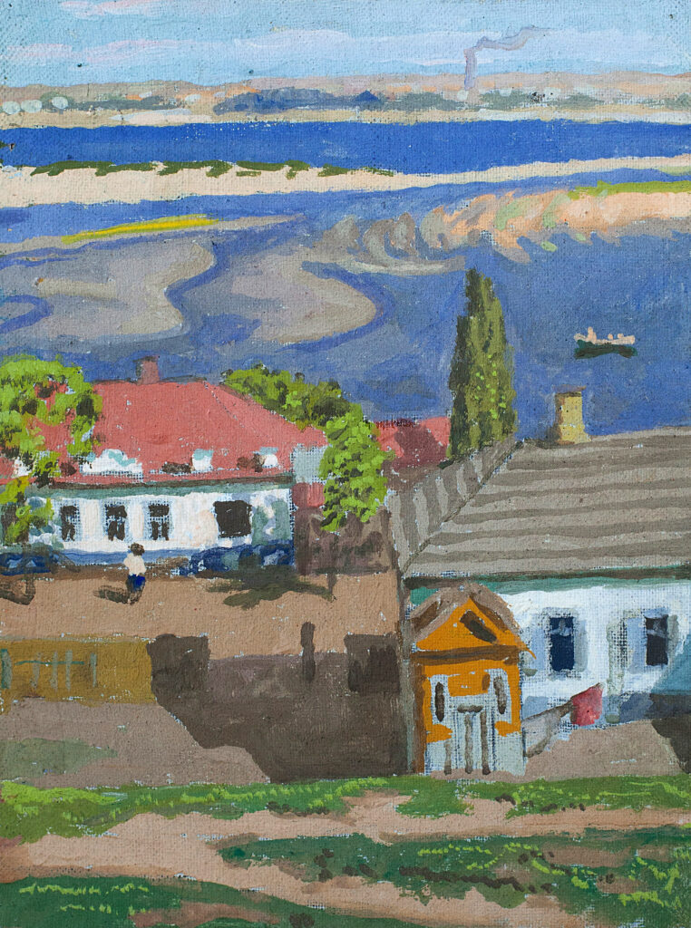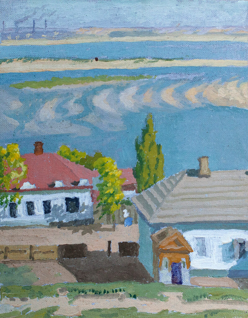 Митець Михайло Сапожников останні роки життя хворів та майже не виходив із дому. Його єдиним вікном у світ став краєвид із правого берега Дніпра на лівий – із трубами Нижньодніпровського трубопрокатного заводу на горизонті. Саме цю панораму художник писав знову і знову, позначаючи роботи промовисто: "мотив один, настрій два", "мотив один, настрій три".