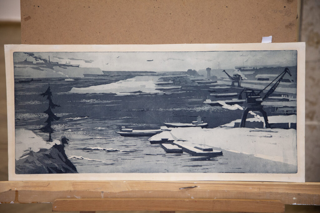 Ще одна цікава робота з колекції Дніпровського художнього музею – ліногравюра Петра Магра "Місто на Дніпрі", створена у 1980-х роках.