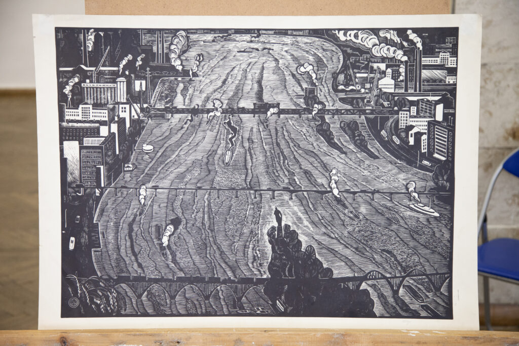 Це чорно-білий панорамний пейзаж, у якому художник зібрав ключові символи міста другої половини ХХ століття: річку, заводи, житлові масиви, мости, що з’єднують береги, і навіть постать Шевченка на Монастирському острові.