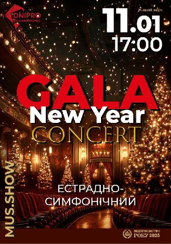 Величний бал святкової музики "GALA NEW YEAR CONCERT" у Дніпрі. На вас чекатиме новорічне естрадно-симфонічне шоу, що поєднує велич оркестрового звучання та яскравість естрадної енергії. У програмі — улюблені пісні й мелодії, які дарують відчуття свята та об’єднують серця.